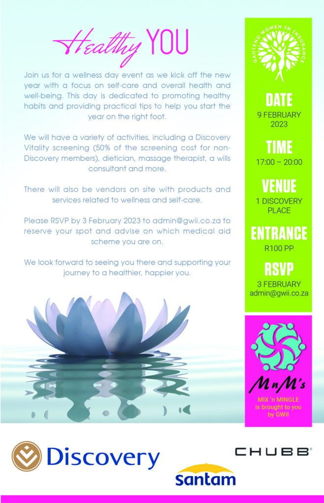 Join Gauteng Women in Insurance (GWII) for the Mix n Mingle – Healthy YOU for a wellness day event as we kick off the new year with a focus on self-care and overall health and well-being. This day is dedicated to promoting healthy habits and providing practical tips to help you start the year on the right foot.